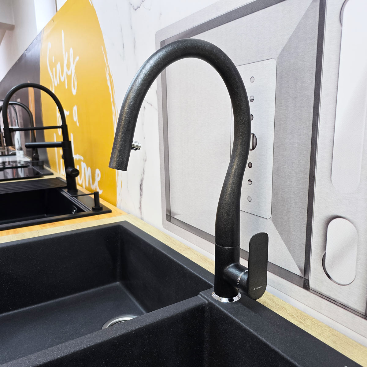 Adaugă în coșMAI MULTEBaterie CookingAid NEWMIX 90 Black Metal Quartz cu finisaj NEGRU Metalic antiamprenta si furtun dus retractabil / extractibil + buton jet/dus