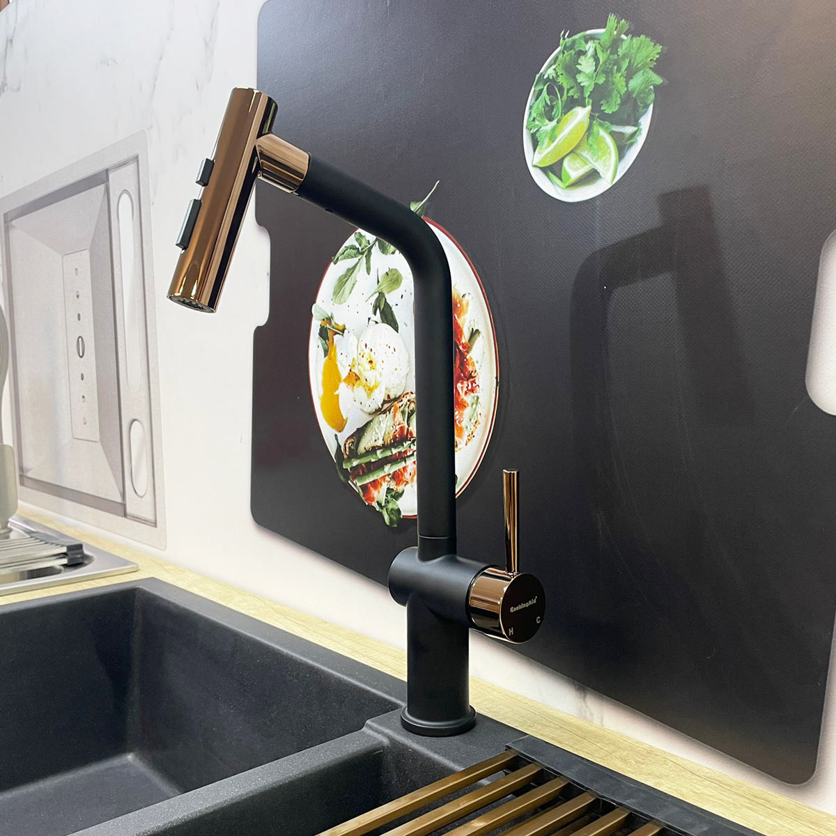 Adaugă în coșMAI MULTEBaterie CookingAid Ferrara Black/Rose Gold finisaj negru + aramiu (auriu roșiatic) cu furtun dus extractibil si buton schimbare dus/jet, culoare negru cu auriu roze