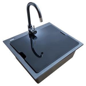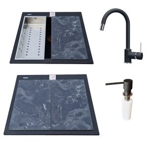Citește mai multMAI MULTEChiuveta bucatarie granit CookingAid Cube ON5610 Neagra / Black Metal quartz + Baterie CookingAid Indiana + Dozator Sapun Negru + Tavita inox + 2 tocatoare HPL Ardesia + accesorii montaj