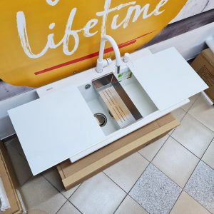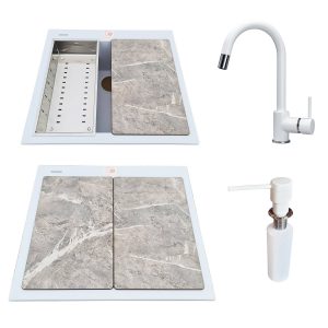 Adaugă în coșMAI MULTEChiuveta bucatarie granit CookingAid Cube ON5610 Alba / Polar White + Baterie CookingAid Indiana + Dozator Sapun Alb + Tavita inox + 2 tocatoare HPL Tortora + accesorii montaj