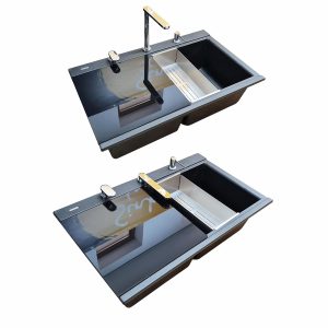 Adaugă în coșMAI MULTESet complet Chiuveta bucatarie granit dubla cu 2 cuve CookingAid Kinga LX8620 Neagra / Black Metal quartz + Baterie telescopica CookingAid Box QS 3000 + 2 Tocatoare sticla Temperizata Neagra +Tavita scurgere inox + Dozator detergent + accesorii montaj