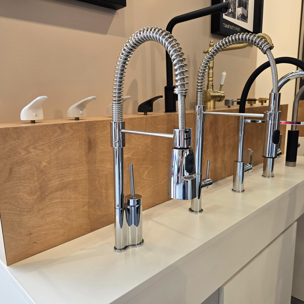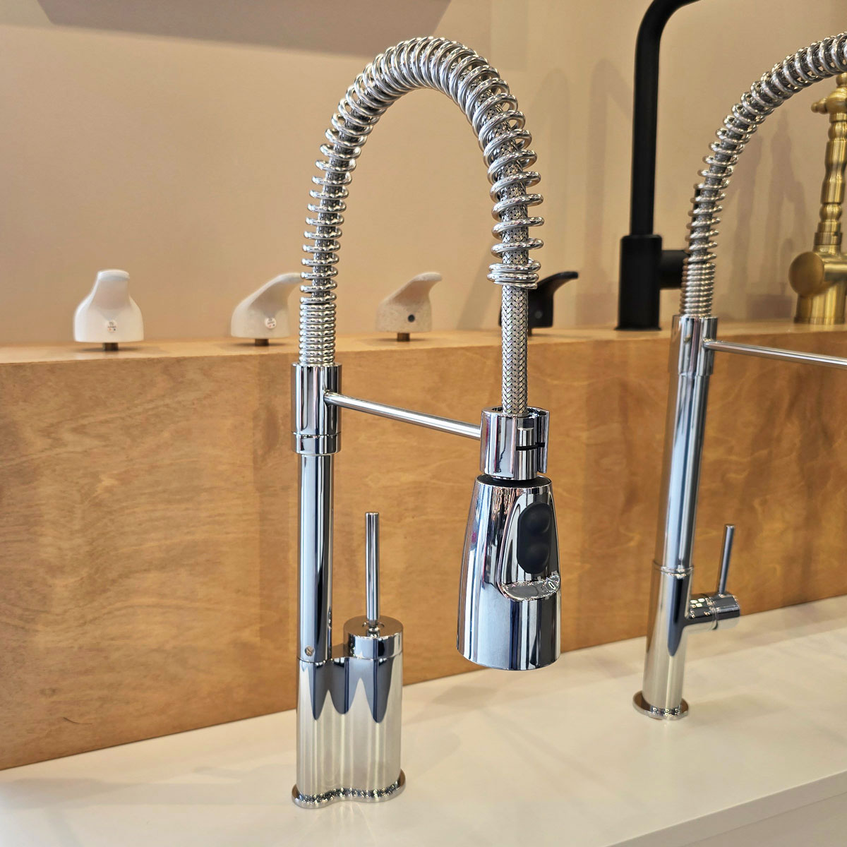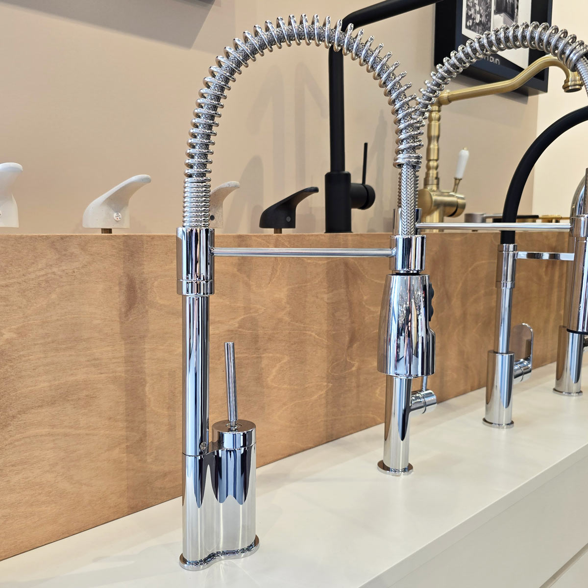 Bateria de chiuveta CookingAid SPRING CHROME 40 este o baterie de bucatarie profesionala din gama premium CookingAid, confectionata din alama cromata de cea mai buna calitate si este prevazuta cu cap flexibil detasabil + buton interschimbabil jet/dus.