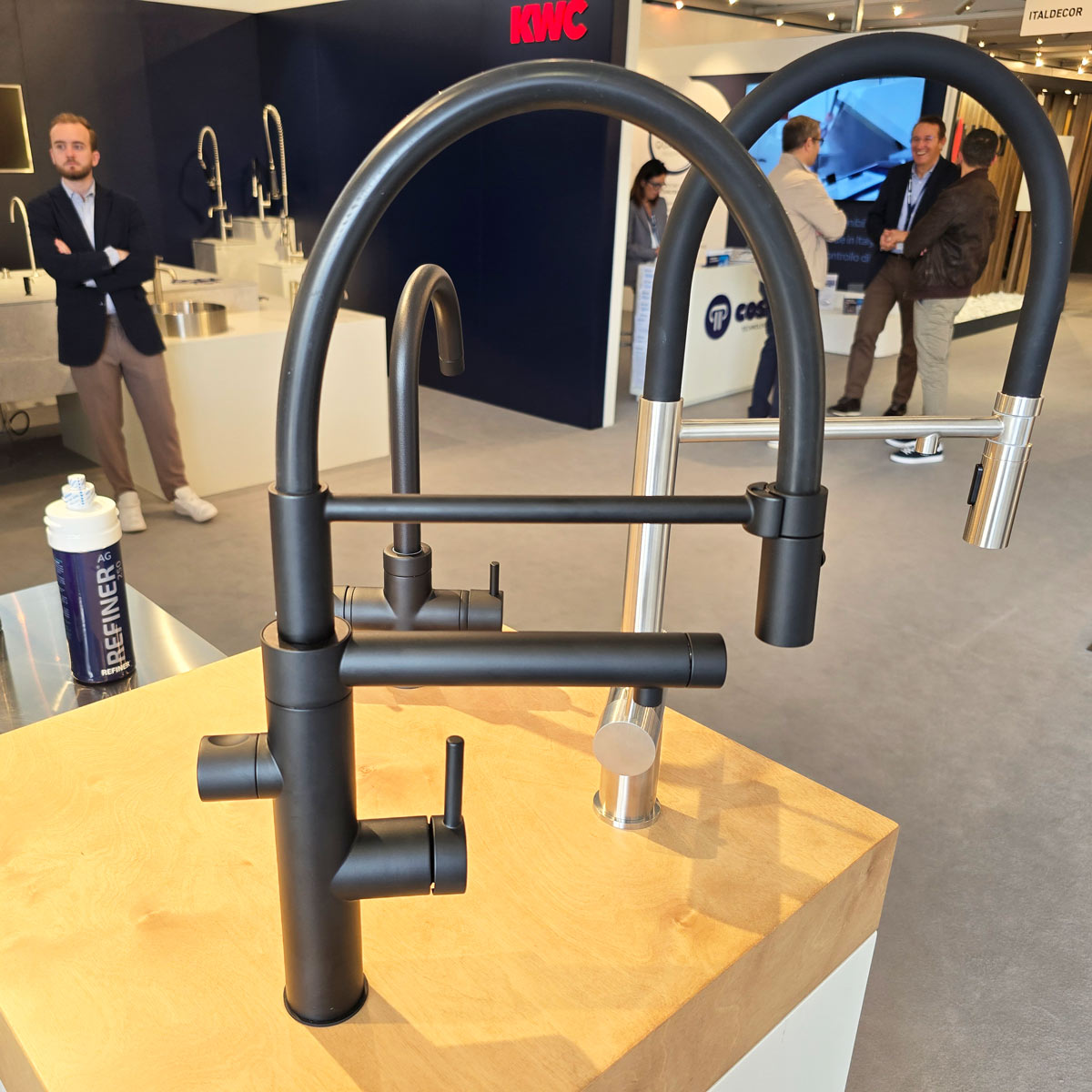 Este un model din gama premium, lansat recent de producatorul italian, cu finisaj elegant negru mat si perlator detasabil. Bateria este prevazuta cu doua sisteme separate de control al apei: maneta principala cu tija actioneaza apa calda si apa rece, iar maneta secundara fara tija actioneaza sistemul de filtrare a apei integrat in corpul bateriei (vezi pozele cu filtrul extras).