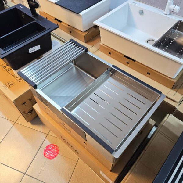 ***Bateria de bucatarie, dozatorul de detergent, tocatorul din lemn de Iroko si tavitele de scurgere din imagini (280.MB, 280.XA, 280.YA, 280.WA. 281.RB), nu sunt incluse ci sunt prezentate ca exemplu de montare a chiuvetei si totodata ca si accesorii recomandate, optionale.