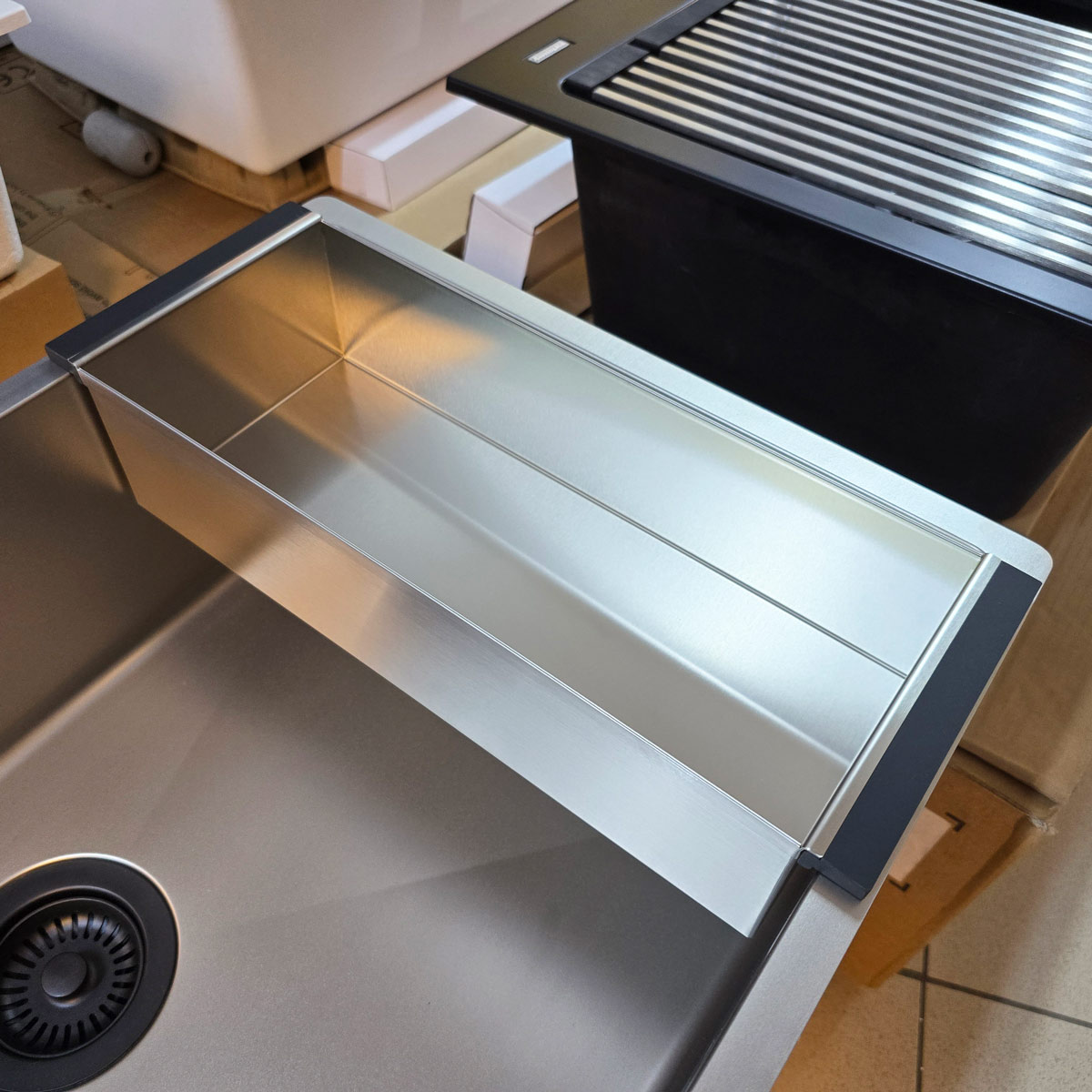 Chiuveta bucatarie inox CookingAid TASCA CANOVA CA70 DuriX mata, rezistenta la zgarieturi si ventil/preaplin negru, cu montaj pe blat, sub blat sau la nivelul blatului si accesorii montaj