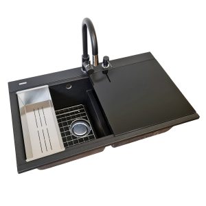 Adaugă în coșMAI MULTEChiuveta bucatarie granit CookingAid Cube ON3322 Workstation Neagra / Black Metal quartz + Baterie Newmix 90 + accesorii montaj