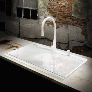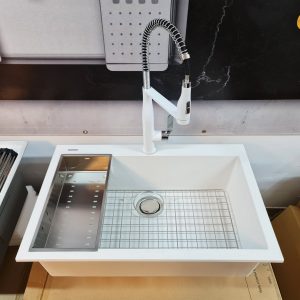 Adaugă în coșMAI MULTEChiuveta bucatarie granit CookingAid Cube ON7610 Alba / Polar White + Baterie CookingAid NEO Spring White Chrome + tavita scurgere inox + gratar protectie fund chiuveta + accesorii montaj