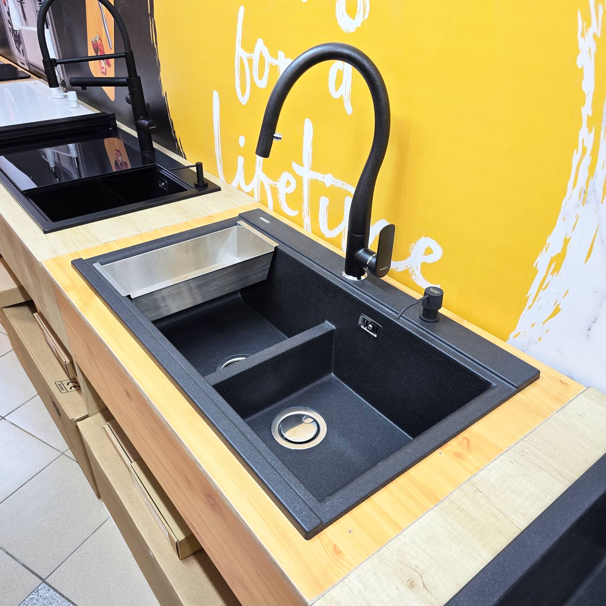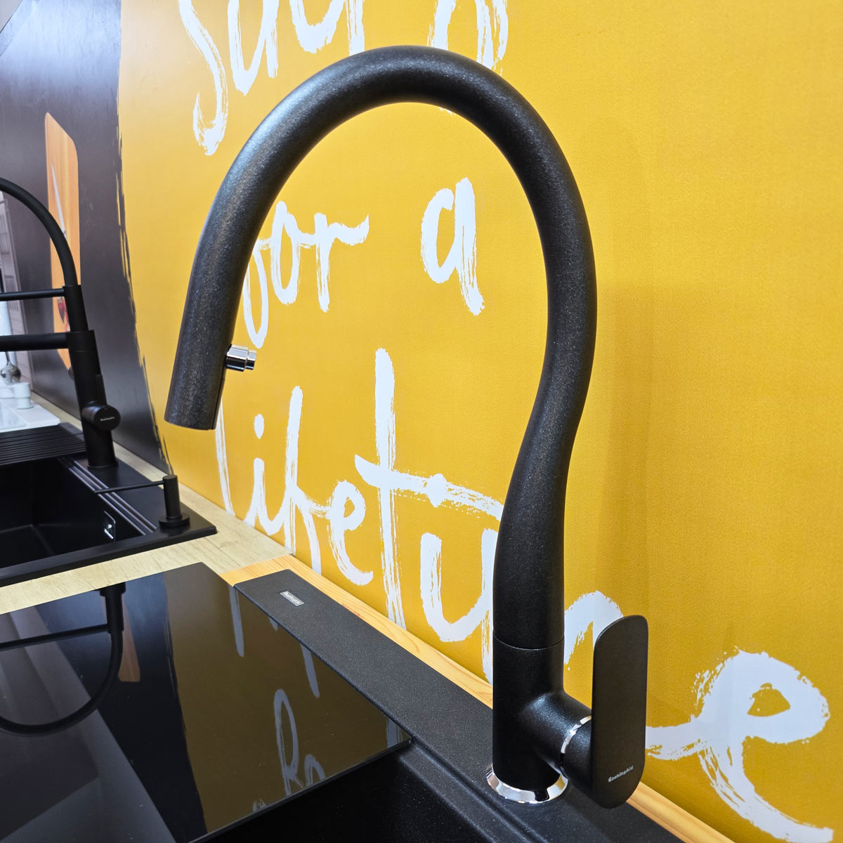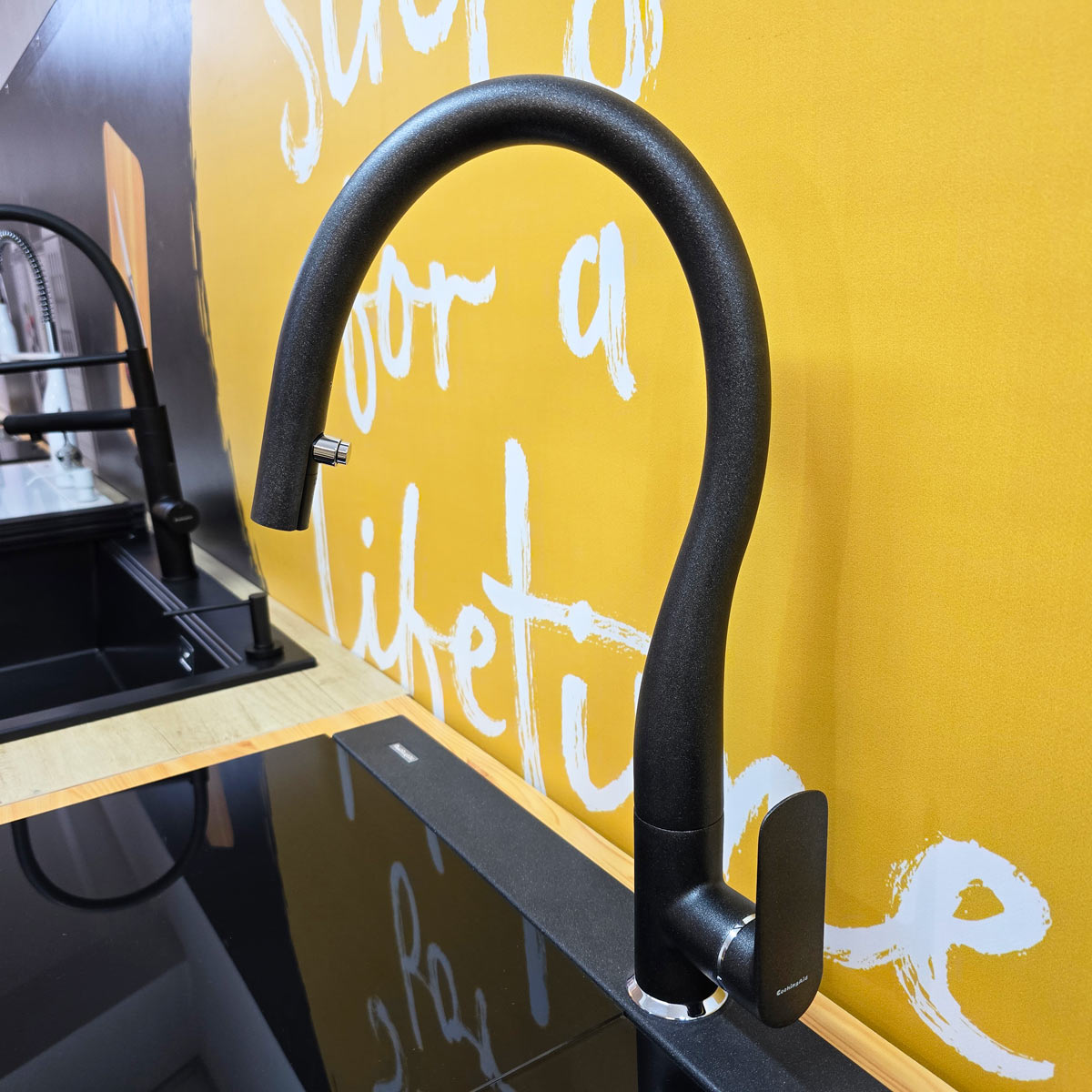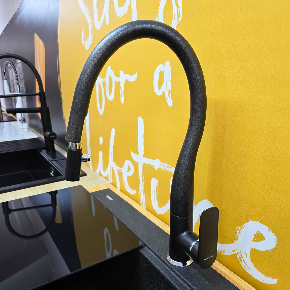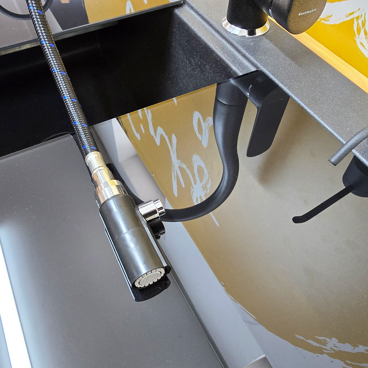 -bateria CookingAid Flores Black rotativa 180° cu cap extractibil si buton schimbare jet adunat/jet tip spray, pe culoare negru metalic, identica cu culoarea chiuvetei (vezi detalii baterie si schita dimensiuni in prezentarea detaliata a bateriei la categoria baterii granit);