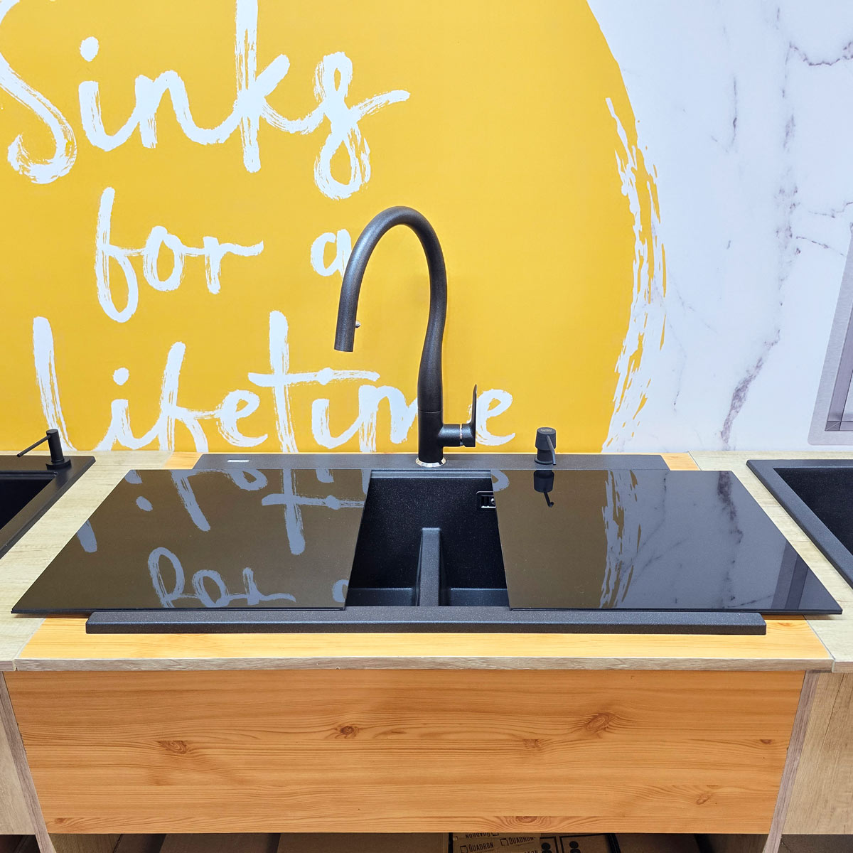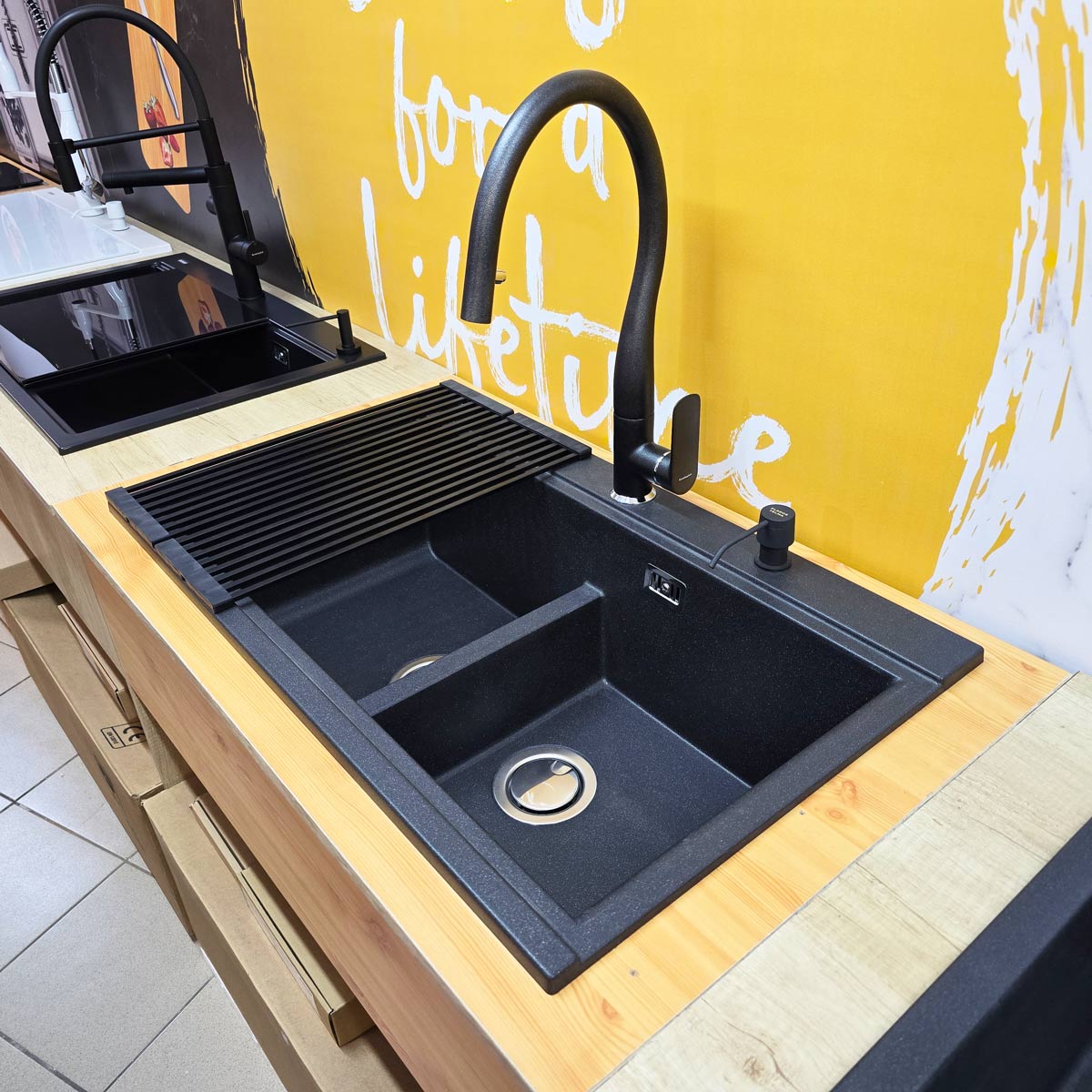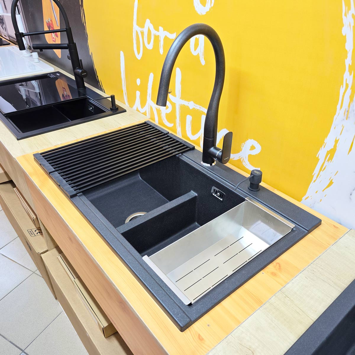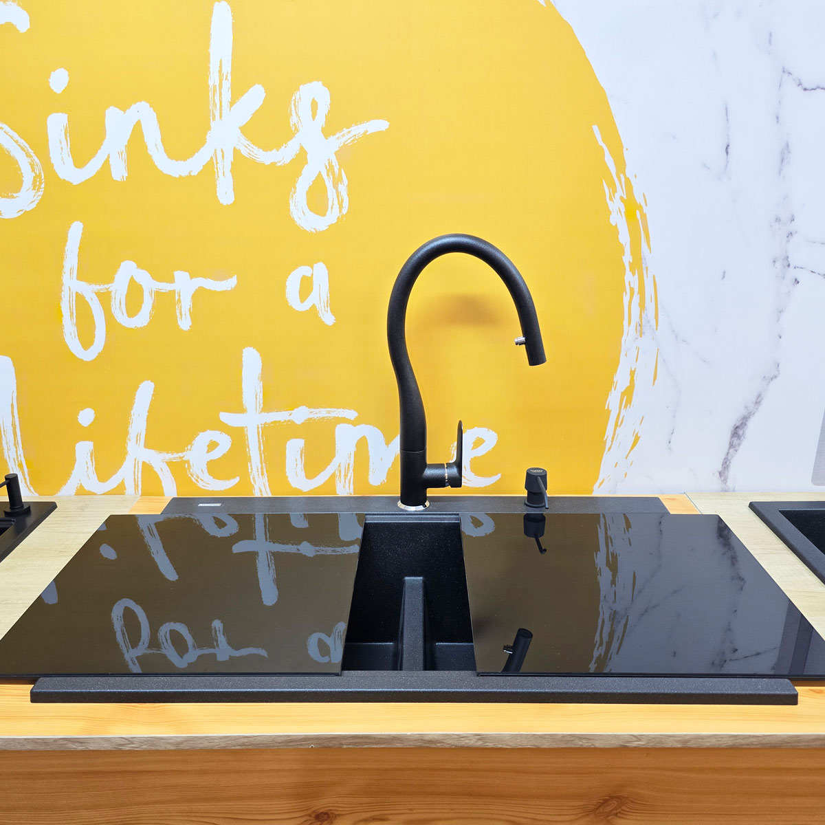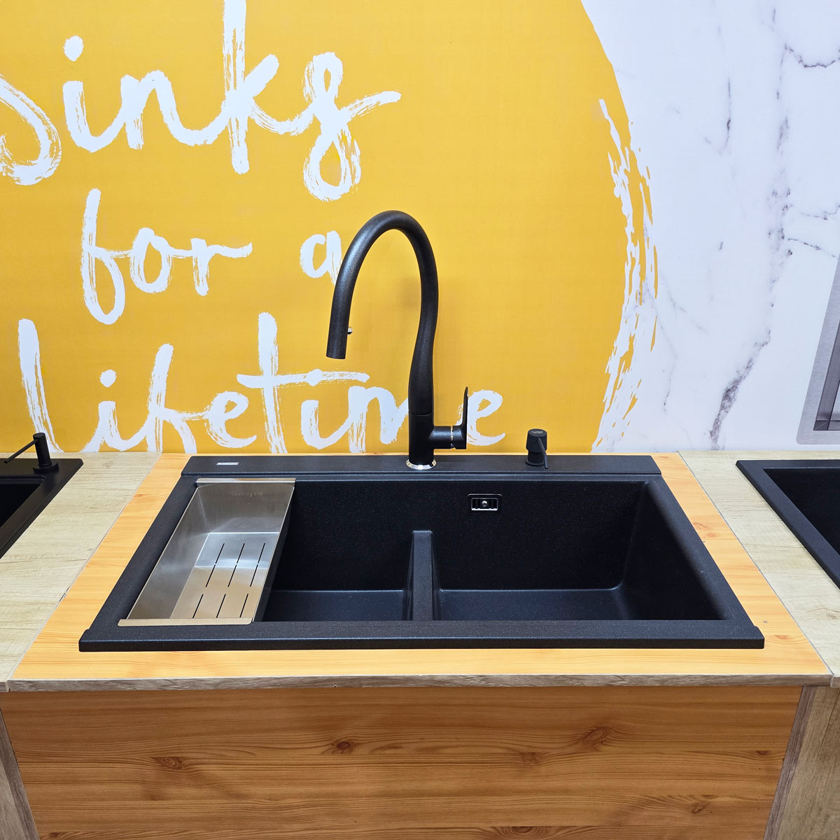 -bateria CookingAid Flores Black rotativa 180° cu cap extractibil si buton schimbare jet adunat/jet tip spray, pe culoare negru metalic, identica cu culoarea chiuvetei (vezi detalii baterie si schita dimensiuni in prezentarea detaliata a bateriei la categoria baterii granit);