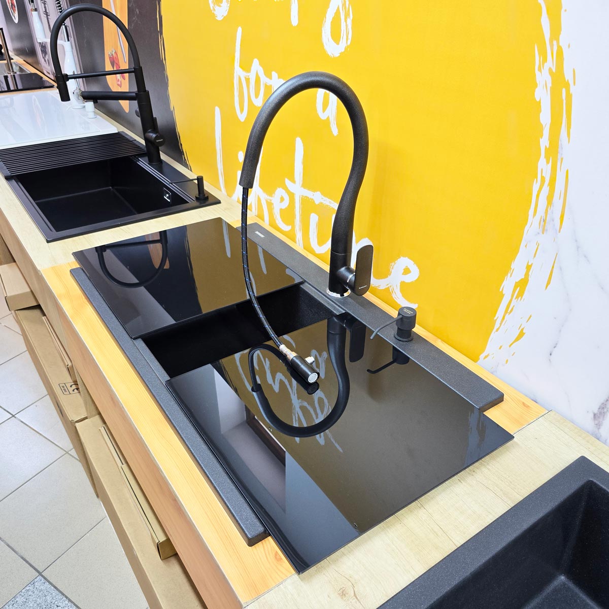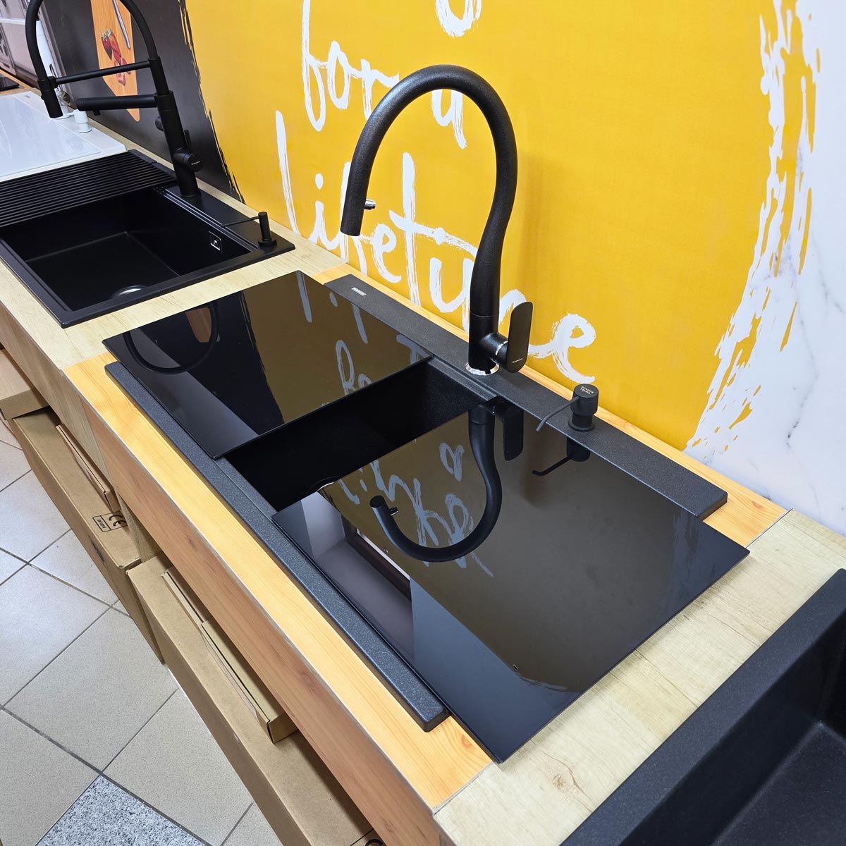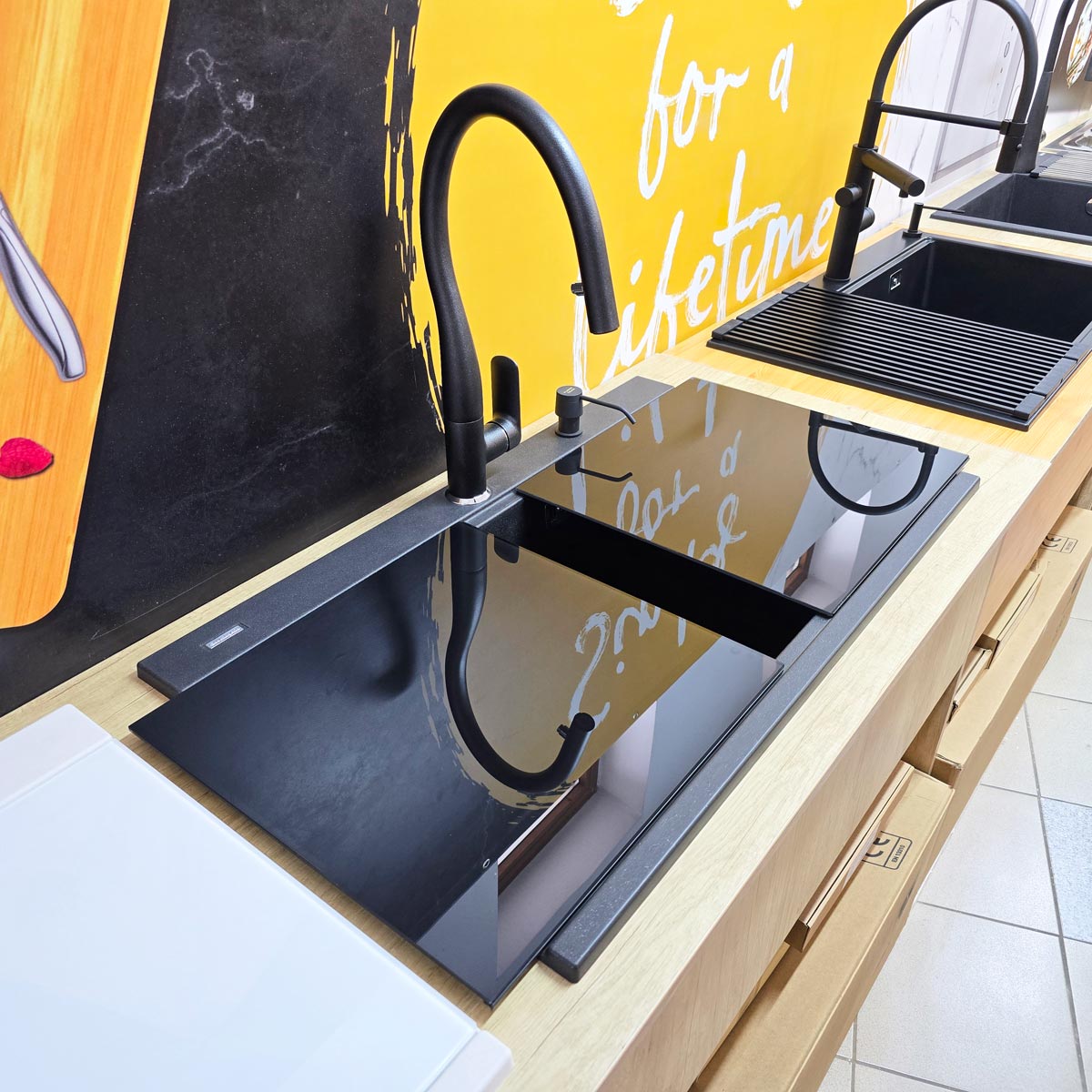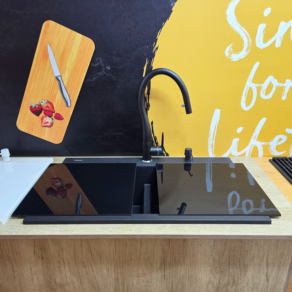 -2 tocatoare/capace sticla negre CookingAid din sticla temperizata de 410mm x 428mm x 5mm, personalizate pentru chiuveta CookingAid Kinga LX8620 Black astfel incat chiuveta sa para invizibila la nivelul blatului si totodata poate sa faca o pereche buna cu o plita pe inductie sau vitroceramica de culoare neagra. Tocatoarele pot fi puse pe chiuveta pe deasupra dar ele pot sa si culiseze (slide) stanga-dreapta inspre blat, pe treapta longitudinala a chiuvetei, treapta special conceputa pentru accesoriile chiuvetei. Fiecare tocator are aplicata pe margini si pe verso o banda ABS care faciliteaza culisarea acestuia pe suprafata chiuvetei. Banda din ABS inalta tocatorul cu 2mm pe marginile acestuia, asadar in cazul folosirii tavitei de inox a chiuvetei, tocatorul de sticla va culisa peste tavita deoarece din latimea de 20mm a marginii pe care culiseaza sticla, doar 10mm sunt folositi de buza tavitei si 10mm de banda de ABS, astfel incat cele doua accesorii nu se intalnesc atunci cand culiseza unul peste altul;